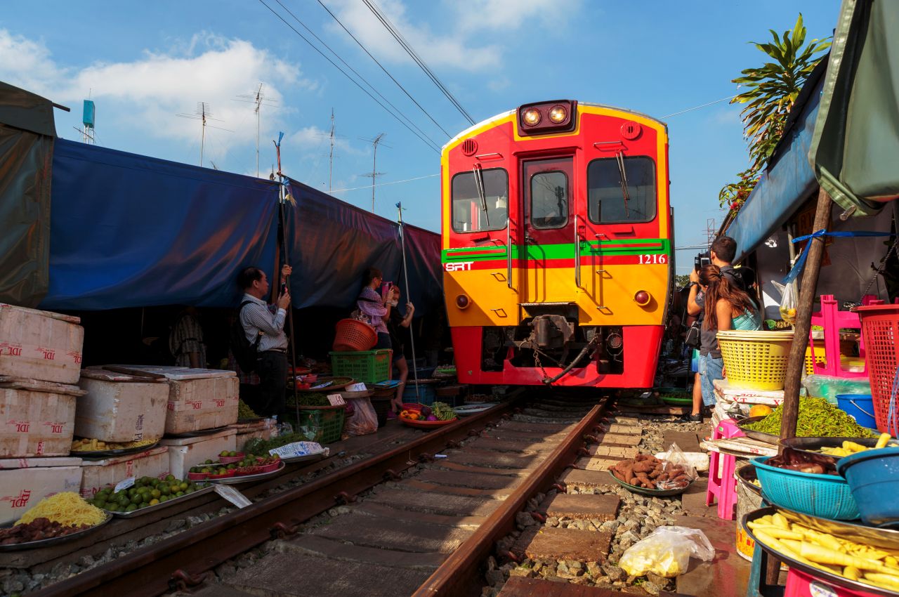 Zum Abschluss des Tages erleben Sie den berühmten Zugmarkt von Samut Songkhram, den die Thais „Talad Rom Hub“ nennen. Mehrmals täglich fährt ein Zug direkt durch die schmalen Marktgassen. Wenn das Signal ertönt, werden die Stände in kurzer Zeit zurückgezogen, bevor sie nach der Durchfahrt des Zuges wieder aufgebaut werden – ein faszinierendes Schauspiel des Alltags.